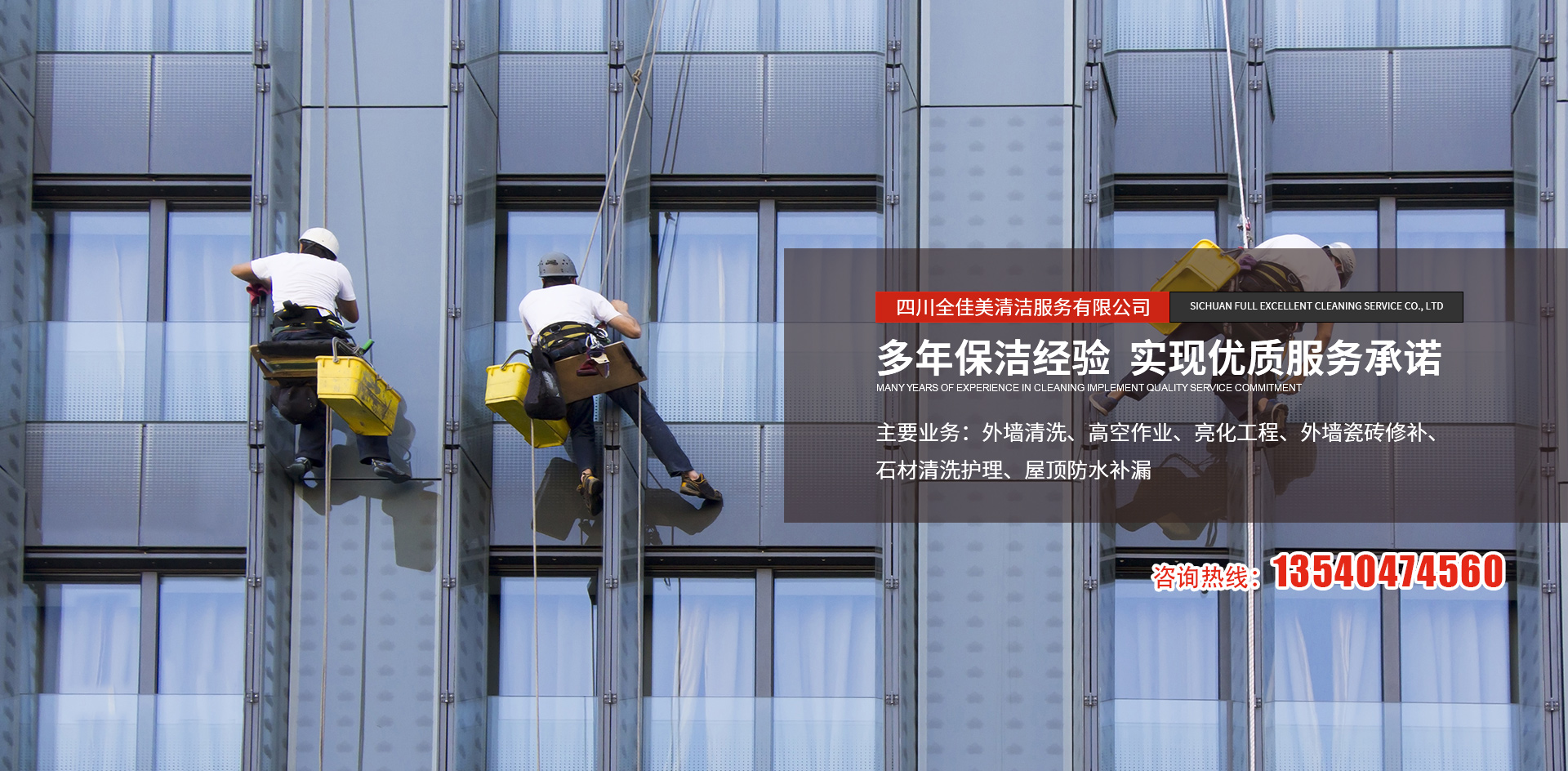 四川全佳美清潔服務(wù)有限公司成立于2017年11月20日,注冊資本200萬元人民幣,是一家專業(yè)從事高空外墻清洗,外墻維修,開荒保潔,石材養(yǎng)護(hù),外墻防水等一體化的工程服務(wù)公司。公司先后服務(wù)于成都鐵路培訓(xùn)學(xué)校,雙流空港酒店,省體育館等寫字樓及工業(yè)園區(qū)的外墻清洗保潔及維修服務(wù)。經(jīng)過多年的發(fā)展與努力,公司已具備一定的規(guī)模及實力。現(xiàn)擁有一支技術(shù)精湛的服務(wù)團(tuán)隊,以高標(biāo)準(zhǔn)的服務(wù)品質(zhì),專業(yè)的安全技術(shù)實力,為全川不同群體的客戶提供更安全,更周到的清洗服務(wù)解決方案,期待與你的合作。
